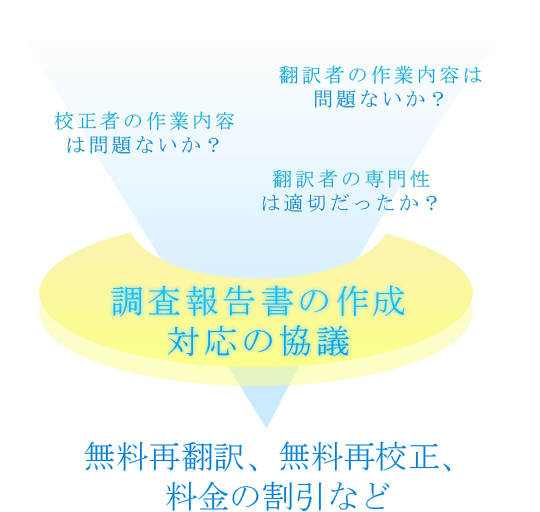 品質(zhì)管理チェックでは、翻訳者?クロスチェッカー?校正者(ネイティブチェッカー)それぞれの工程で瑕疵がなかったかどうかを調(diào)査します。調(diào)査結(jié)果に基づいてお客様に適切な対応をさせていただきます。