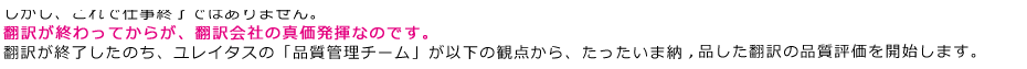 品質(zhì)管理チームとは? 品質(zhì)管理チームに所屬するスタッフは、直接的にお客様の原稿の英文翻訳に関わることはありません。日々、納品した翻訳原稿を精査し、品質(zhì)評価だけを?qū)熼Tに行っている獨立した監(jiān)査機関です。経験と実力のある複數(shù)名の日英のバイリンガルスタッフ、英語ネイティブスタッフから構成されています。 |